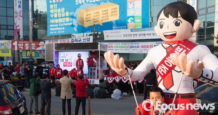 (세종=포커스뉴스) 5일 오후 세종시 조치원읍 조치원역 앞 교차로에서 선거운동원들이 박종준 후보의 지지를 호소하고 있다.