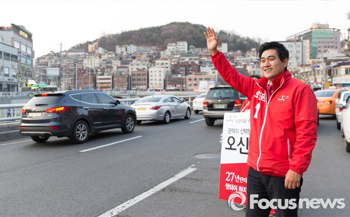 (서울=포커스뉴스) 5일 오후 서울 관악구 김한의원 앞에서 오신환 새누리당 관악구을 후보가 선거유세를 하고 있다.