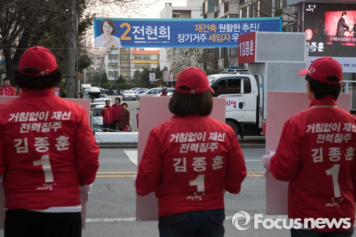 (서울=포커스뉴스) 5일 오후 서울 강남구 개포주공1단지아파트 인근에서 20대 총선에 출마한 김종훈 새누리당 강남을 후보의 선거운동원들이 유권자들에게 지지를 호소하고 있다. 운동원들 반대편에는 전현희 더불어민주당 강남을 후보의 현수막이 걸려있다.