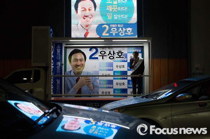 (서울=포커스뉴스) 5일 오후 서울 서대문구 아현역 인근에서 더불어민주당 우상호 서대문갑 후보가 시민들을 만나 유세를 하고 있다.