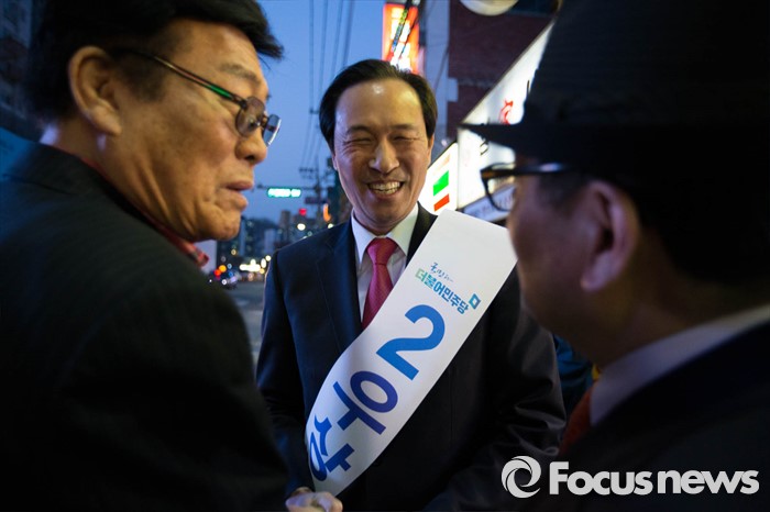 (서울=포커스뉴스) 5일 오후 서울 서대문구 아현역 인근에서 더불어민주당 우상호 서대문갑 후보가 시민들을 만나 유세를 하고 있다.