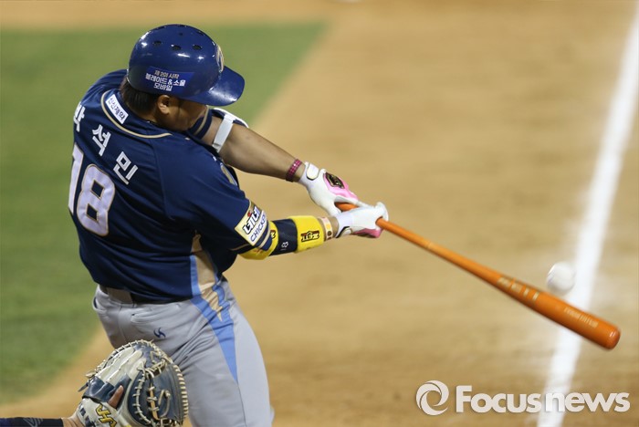 (서울=포커스뉴스) 5일 서울 잠실구장에서 열린 2016프로야구 NC-두산 경기 5회초 2사 만루에서 NC 박석민이 2타점 좌전안타를 날리고 있다.