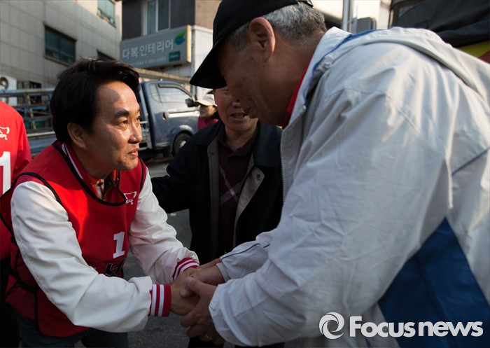 (서울=포커스뉴스) 5일 오후 서울 서대문구 충현동 인근에서 새누리당 서대문갑 이성헌 후보가 거리유세를 하고 있다.