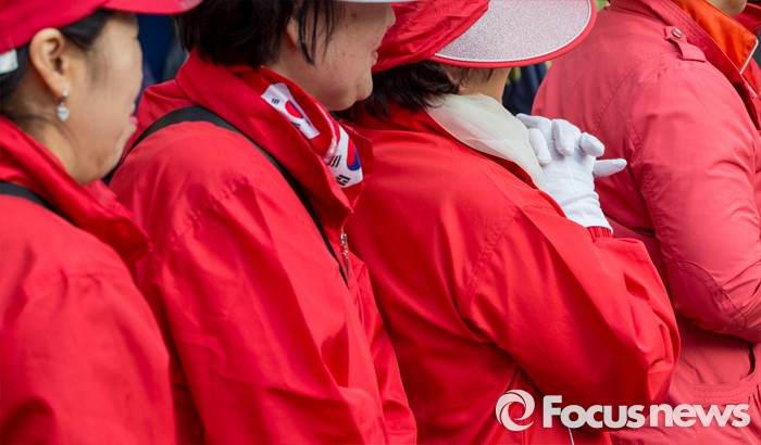 (서울=포커스뉴스) 5일 오후 서울 중구 약수시장 인근에서 열린 지상욱 새누리당 중구성동구을 후보 선거유세에서 지 후보 지지자들이 붉은 상의를 입고 모여있다.
