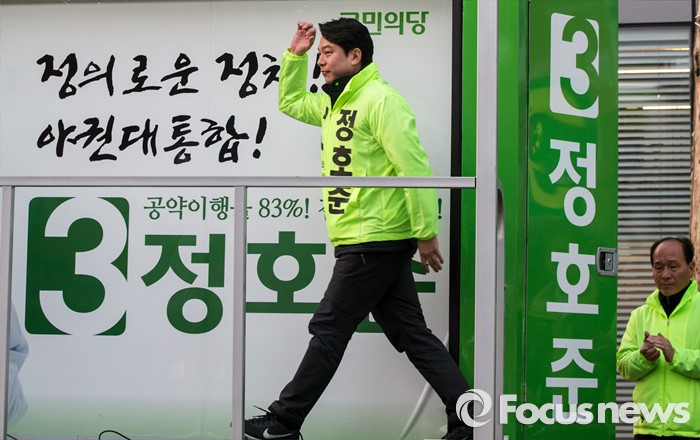(서울=포커스뉴스) 5일 오후 서울 중구 충정로역 인근에서 선거유세에 나선 정호준 국민의당 중구성동구을 후보가 유세차에 오르고 있다.