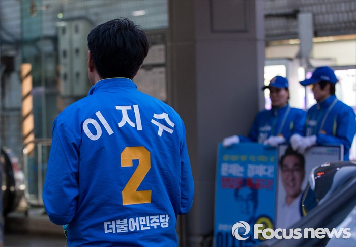 (서울=포커스뉴스) 5일 오후 서울 중구 신당역 인근에서 선거유세에 나선 이지수 더불어민주당 중구성동구을 후보가 퇴근길의 유권자에게 지지를 호소하고 있다.