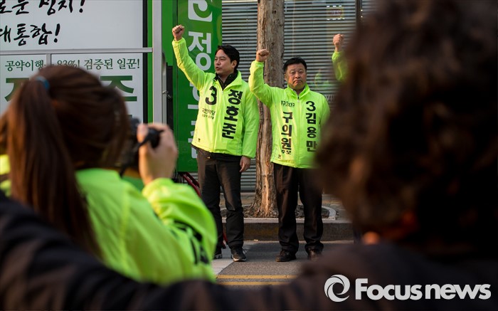(서울=포커스뉴스) 5일 오후 서울 중구 충정로역 인근에서 선거유세에 나선 정호준 국민의당 중구성동구을 후보가 유권자들의 지지를 호소하고 있다.