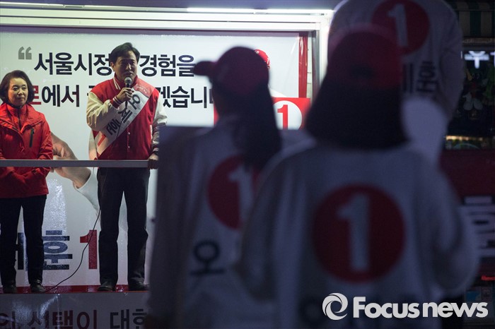 (서울=포커스뉴스) 20대 총선을 8일 앞둔 5일 오후 서울 종로구 통인시장 일대에서 오세훈 새누리당 종로구 후보가 퇴근길 선거유세를 하고 있다.