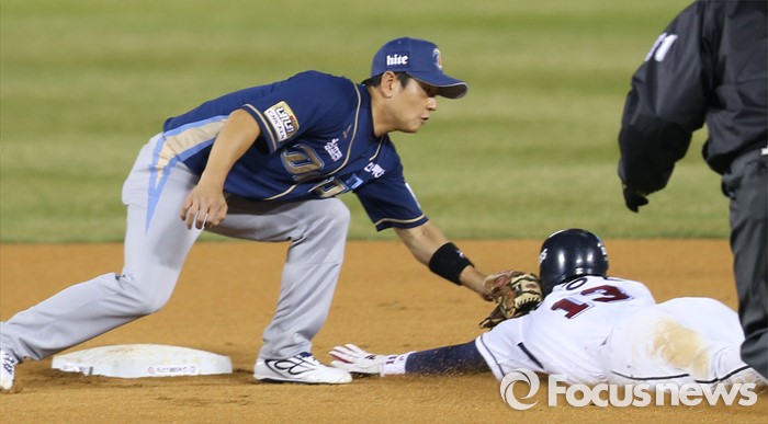(서울=포커스뉴스) 5일 서울 잠실구장에서 열린 2016프로야구 NC-두산 경기 6회말 무사 1루에서 두산 정수빈이 3진 당하는 사이에 1루주자 허경민이 2루 도루를 시도하다 아웃되고 있다.