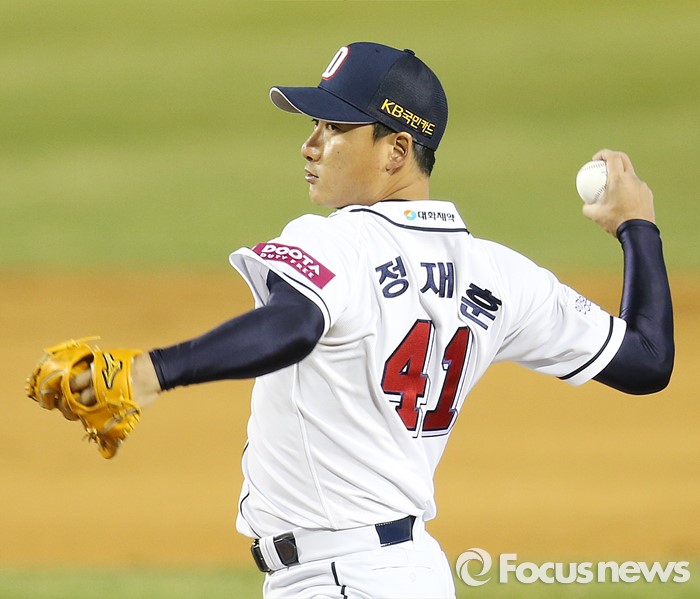 (서울=포커스뉴스) 5일 서울 잠실구장에서 열린 2016프로야구 NC-두산 경기에서 7회 등판한 두산 투수 정재훈이 투구하고 있다.