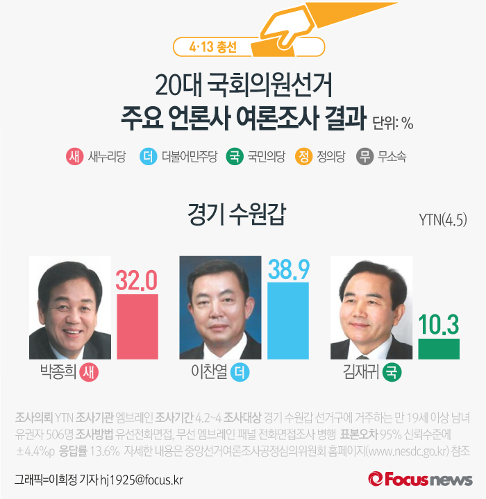(서울=포커스뉴스) 4·13 총선이 얼마 남지 않았습니다. 각 지역구별로 엎치락 뒤치락 하는 판세인데요. 각 언론사에서 실시한 주요 지역구 여론조사 결과를 살펴 보시죠.