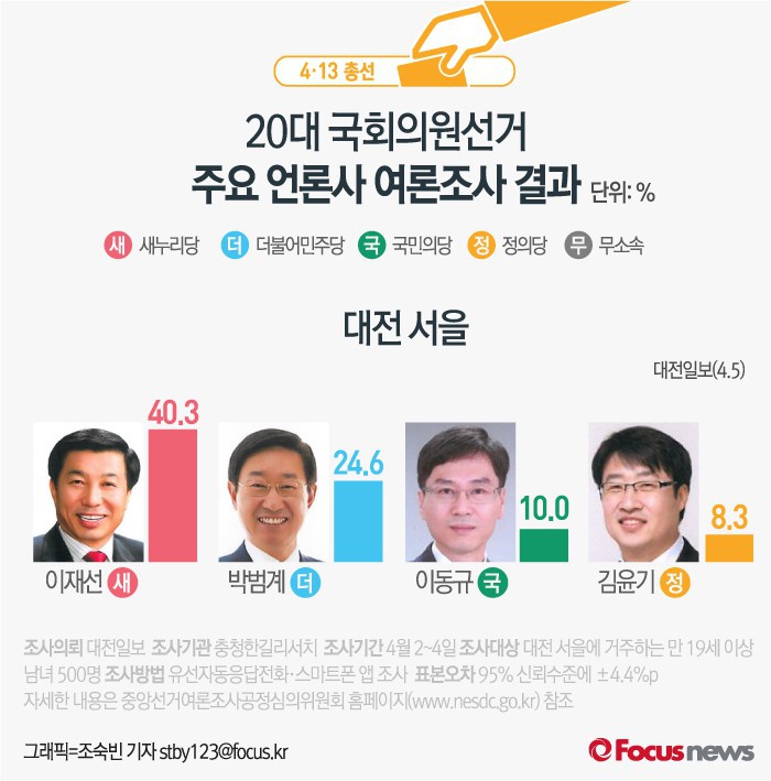 (서울=포커스뉴스) 4·13 총선이 얼마 남지 않았습니다. 각 지역구별로 엎치락 뒤치락 하는 판세인데요. 각 언론사에서 실시한 주요 지역구 여론조사 결과를 살펴 보시죠.