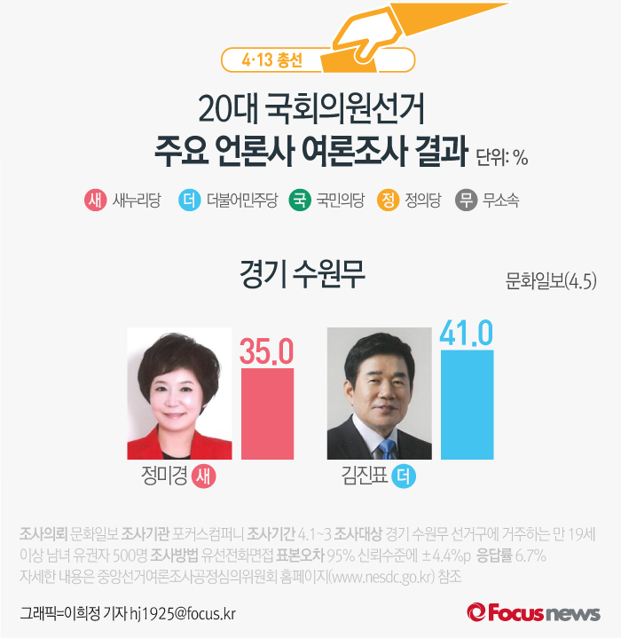 이번에 보실 지역구는 수원무 선거구입니다.(서울=포커스뉴스) 문화일보가 포커스컴퍼니에 의뢰해 5일 발표한 여론조사 결과에 따르면 새누리당 정미경 후보의 지지율은 35.0%, 더불어민주당 김진표 후보의 지지율은 41.0%를 기록했다.2016.04.05 이희정 기자 (서울=포커스뉴스) YTN이 엠브레인에 의뢰해 5일 발표한 여론조사 결과에 따르면 새누리당 정미경 후보의 지지율은 29.5%, 더불어민주당 김진표 후보는 45.9%를 기록했다.2016.04.05 이희정 기자 (서울=포커스뉴스) 서울경제가 리얼미터에 의뢰해 4일 발표한 여론조사 결과에 따르면 새누리당 정미경 후보의 지지율은 38.4%, 더불어민주당 김진표 후보의 지지율은 33.2%, 국민의당 김용석 후보는 7.4%를 기록했다.2016.04.04 이희정 기자