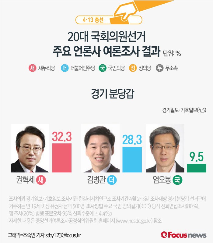 (서울=포커스뉴스) 4·13 총선이 얼마 남지 않았습니다. 각 지역구별로 엎치락 뒤치락 하는 판세인데요. 각 언론사에서 실시한 주요 지역구 여론조사 결과를 살펴 보시죠.
