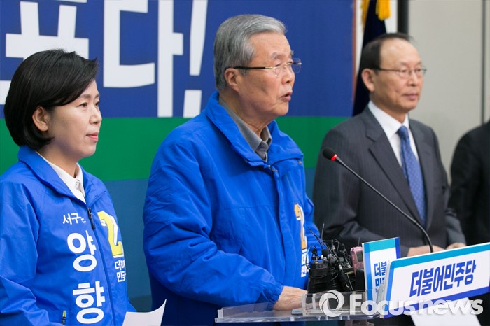 (서울=포커스뉴스) 김종인(가운데) 더불어민주당 비대위 대표가 6일 오전 서울 여의도 국회 당대표회의실에서 광주경제살리기 특별기자회견을 하고 있다. 왼쪽은 양향자 광주 서구을 후보.