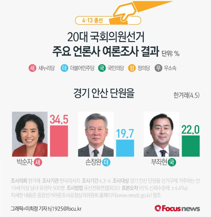 (서울=포커스뉴스) 한겨레가 한국리서치에 의뢰해 5일 발표한 여론조사 결과에 따르면 새누리당 박순자 후보의 지지율은 34.5%, 더불어민주당 손창완 후보의 지지율은 19.7%, 국민의당 부좌현 후보는 22.0%를 기록했다.