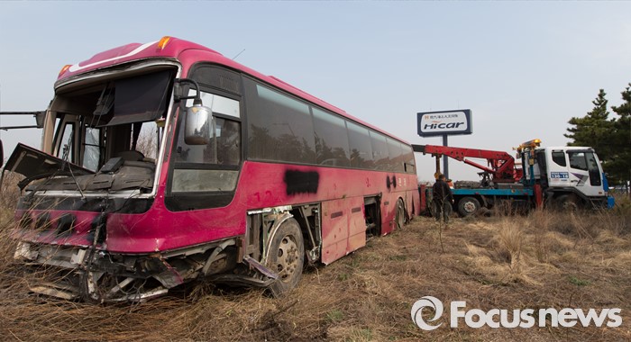 (인천=포커스뉴스) 6일 오전 인천국제공항고속도로에서 통근버스가 전복되는 사고가 발생, 견인작업을 준비하고 있다.