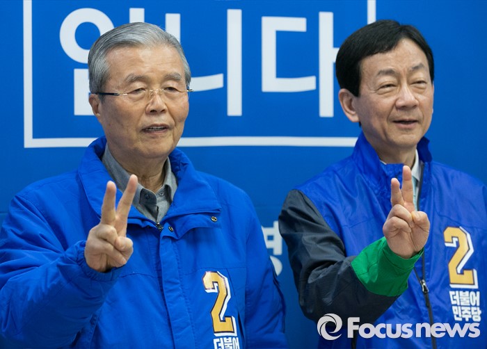 (서울=포커스뉴스) 6일 오전 진영 더불어민주당 서울 용산구 후보 선거사무소에서 열린 중앙선거대책위원회의에 참석한 김종인(왼쪽) 비대위 대표 겸 선대위원장와 진 후보가 포즈를 취하고 있다.