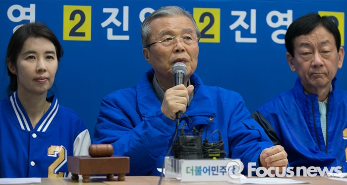(서울=포커스뉴스) 6일 오전 진영 더불어민주당 서울 용산구 후보 선거사무소에서 열린 중앙선거대책위원회의에 참석한 김종인 비대위 대표 겸 선대위원장이 모두발언을 하고 있다. 왼쪽부터 박경미 비례대표 후보, 김 대표, 진 후보.
