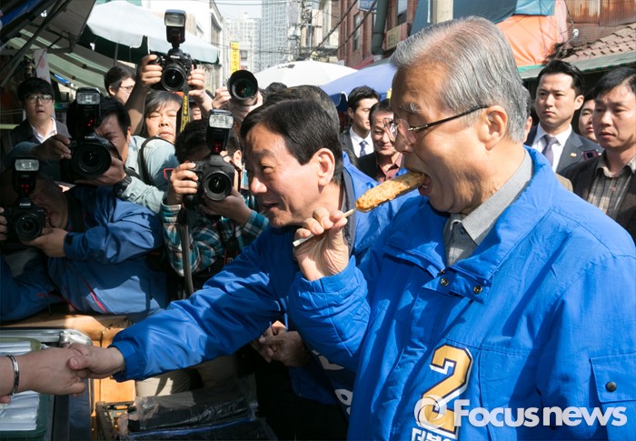 (서울=포커스뉴스) 김종인(오른쪽) 더불어민주당 비대위 대표 겸 선대위원장과 진영 서울 용산구 후보가 6일 오전 용문시장을 방문해 어묵을 맛보고 있다.