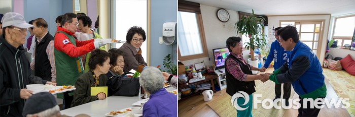 (서울=포커스뉴스) 안대희(왼쪽) 새누리당 마포구갑 후보와 노웅래 더불어민주당 마포구갑 후보가 6일 오전 서울 마포구 일대에서 선거운동을 하고 있다.