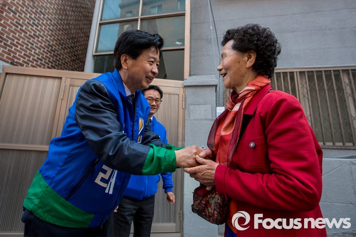 (서울=포커스뉴스) 노웅래 더불어민주당 마포구갑 후보가 6일 오전 서울 마포구 공덕동 일대에서 선거운동을 하고 있다.