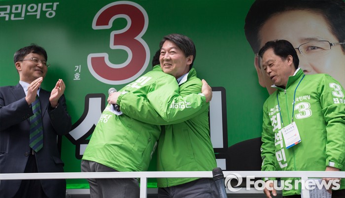 (대구=포커스뉴스) 안철수 국민의당 상임공동대표가 6일 오후 대구광역시 북구 경북대학교 앞에서 최석민 대구 북구갑 후보와 포옹하고 있다.