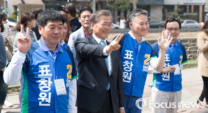 (용인=포커스뉴스) 6일 오전 경기 용인 기흥구 보정동 카페거리에서 문재인 더불어민주당 전 대표가 표창원 더민주 용인시정 후보 지원유세를 하고 있다.