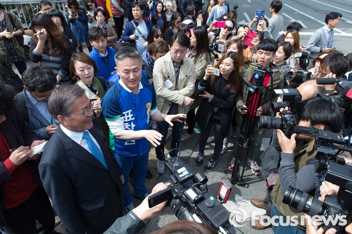(용인=포커스뉴스) 6일 오전 경기 용인 기흥구 보정동 인근에서 문재인 더불어민주당 전 대표가 표창원 더민주 용인시정 후보 지원유세를 하고 있다.