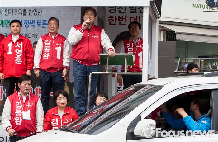 (당진=포커스뉴스) 6일 오후 충남 당진 구 버스터미널 사거리에서 김무성(오른쪽) 새누리당 대표가 김동완 당진시 후보 지원유세를 하고 있다.