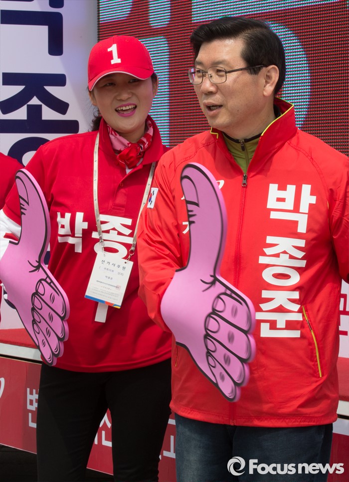 (세종=포커스뉴스) 박종준 새누리당 후보가 6일 오후 세종시 어진동 정부세종청사 인근에서 지지를 호소하고 있다.