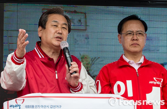 (아산=포커스뉴스) 6일 오후 충남 아산 충무로에서 이명수 새누리당 아산시갑 후보 지원유세에 나선 김무성 대표가 유권자들에게 지지를 호소하고 있다.
