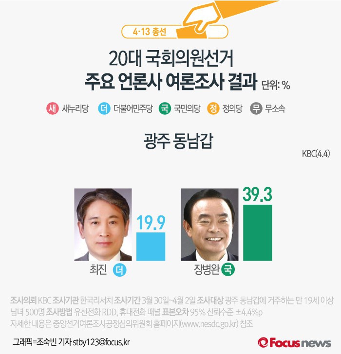 (서울=포커스뉴스) KBC가 한국리서치에 의뢰해 4일 발표한 결과에 따르면 광주 동남갑에서 더민주 최진 후보의 지지율은 19.9%, 국민의당 장병완 후보의 지지율은 39.3%인 것으로 나타났다.