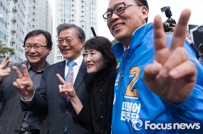 (수원=포커스뉴스) 6일 오후 경기 수원시 영통구 매탄1동 주민센터 앞에서 문재인 더불어민주당 전 대표가 박광온 더민주 수원시정 후보 지원유세를 하고 있다.