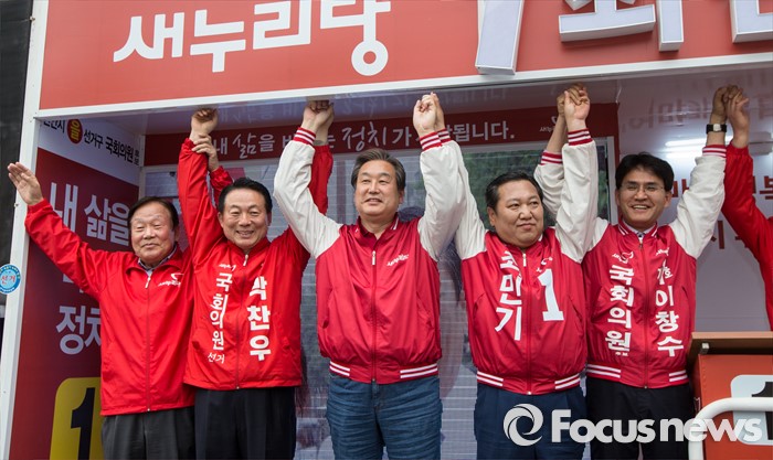 (천안=포커스뉴스) 6일 오후 충남 천안 두정로에서 최민기 새누리당 천안시을 후보 지원유세에 나선 김무성 대표가 유권자들에게 지지를 호소하고 있다.