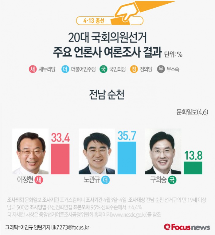 (서울=포커스뉴스) 문화일보가 여론조사기관 포커스컴퍼니에 의뢰해 6일 발표한 결과에 따르면 전남 순천의 지지율은 새누리당 이정현 후보(33.4%), 더불어민주당 노관규 후보(35.7%), 국민의당 구희승 후보(13.8%)순인 것으로 나타났다.