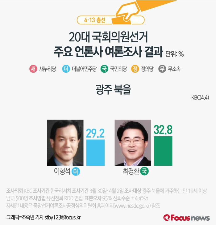 (서울=포커스뉴스) KBC가 한국리서치에 의뢰해 4일 발표한 결과에 따르면 광주 북을에서 더민주 이형석 후보의 지지율은 29.2%, 국민의당 최경환 후보의 지지율은 32.8%인 것으로 나타났다.
