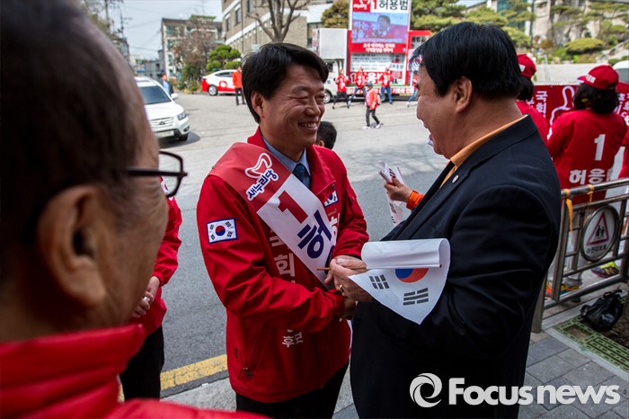 (서울=포커스뉴스) 허용범 새누리당 동대문구갑 후보가 6일 오후 서울 동대문구 제기동 일대에서 유세에 앞서 유권자들과 인사를 나누고 있다.