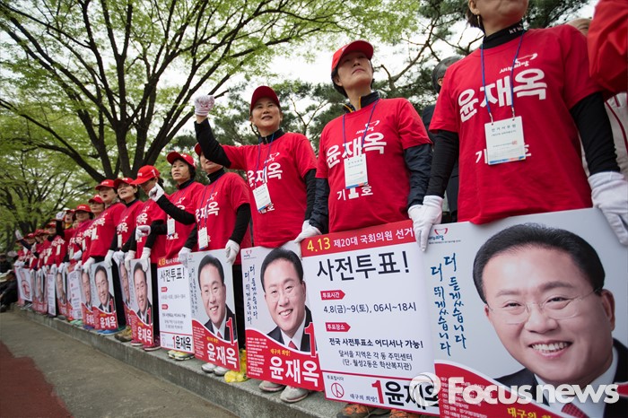 (대구=포커스뉴스) 새누리당 선거운동원들이 6일 오후 대구광역시 달서구 성당동에서 열린 대구지역 후보자 총집결 거리유세에서 기호 1번 윤재옥 후보의 선거 포스터를 들고 있다.