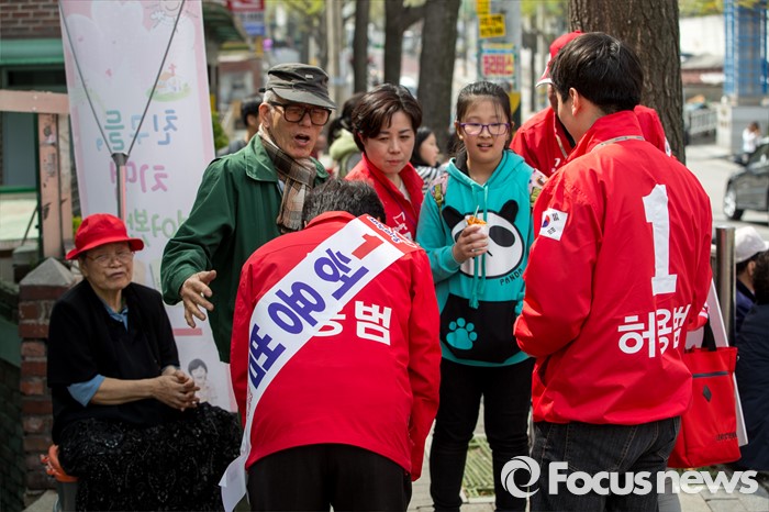 (서울=포커스뉴스) 허용범 새누리당 동대문구갑 후보가 6일 오후 서울 동대문구 제기동 일대에서 유세에 앞서 유권자들에게 인사 하고 있다.
