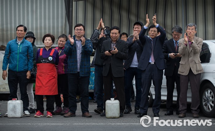 (대구=포커스뉴스) 유승민을 비롯한 대구 무소속 후보들을 지지하는 유권자들이 6일 오후 대구광역시 북구 칠성시장 앞에서 유승민, 권은희, 류성걸 무소속 후보 합동 유세를 지켜보고 있다.