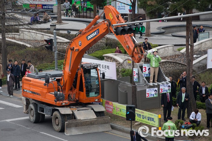 (서울=포커스뉴스) 6일 오후 서울 은평구 연신내 물빛공원에서 고연호 국민의당 은평구을 후보가 포클레인 위에서 유세를 하고 있다.