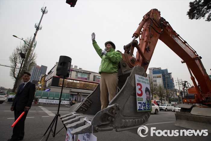 (서울=포커스뉴스) 6일 오후 서울 은평구 연신내 물빛공원에서 고연호 국민의당 은평구을 후보가 포클레인 위에서 유세를 하고 있다.