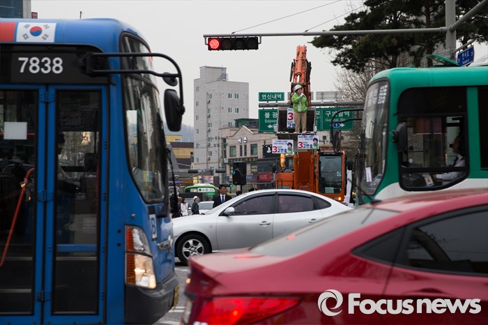 (서울=포커스뉴스) 6일 오후 서울 은평구 연신내 물빛공원에서 고연호 국민의당 은평구을 후보가 포클레인 위에서 유세를 하고 있다.