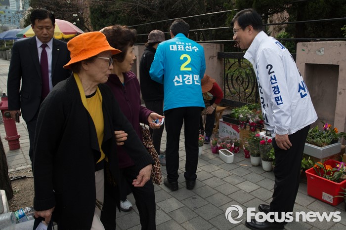 (서울=포커스뉴스) 6일 오후 서울 영등포구 한양아파트 사거리 일대에서 신경민 더불어민주당 영등포구을 후보자가 유세를 하고 있다.