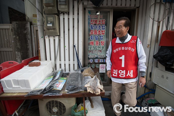 (서울=포커스뉴스) 6일 오후 서울 영등포구 대림1동 일대에서 권영세 새누리당 영등포구을 후보자가 유세를 하고 있다.