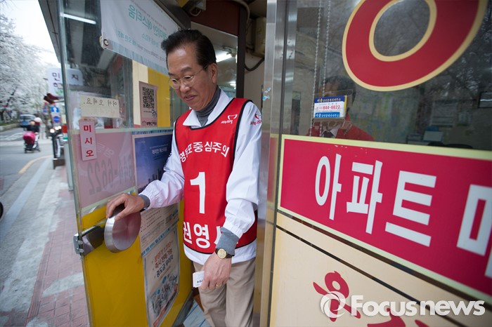 (서울=포커스뉴스) 6일 오후 서울 영등포구 대림1동 일대에서 권영세 새누리당 영등포구을 후보자가 유세를 하고 있다.