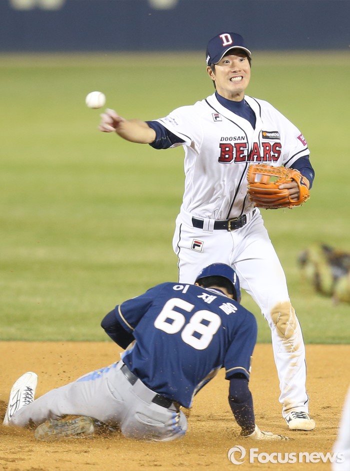 | △ 병살 플레이 시도하는 김재호 |