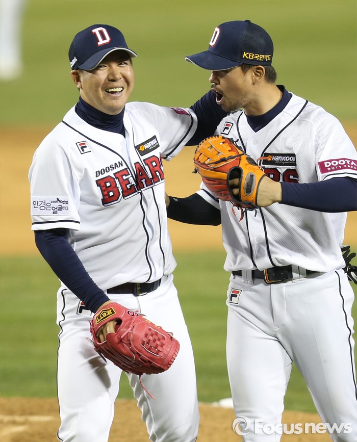 (서울=포커스뉴스) 6일 서울 잠실구장에서 열린 2016 프로야구 NC-두산 경기에서 승리를 지키며 세이브를 올린 이현승이 2루수 오재원과 껴안으며 기뻐하고 있다.