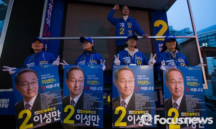 (인천=포커스뉴스) 제20대 총선에 출마한 이성만 더불어민주당 부평갑 후보가 6일 오후 인천 부평구 부개역 인근에서 선거운동을 하고 있다.